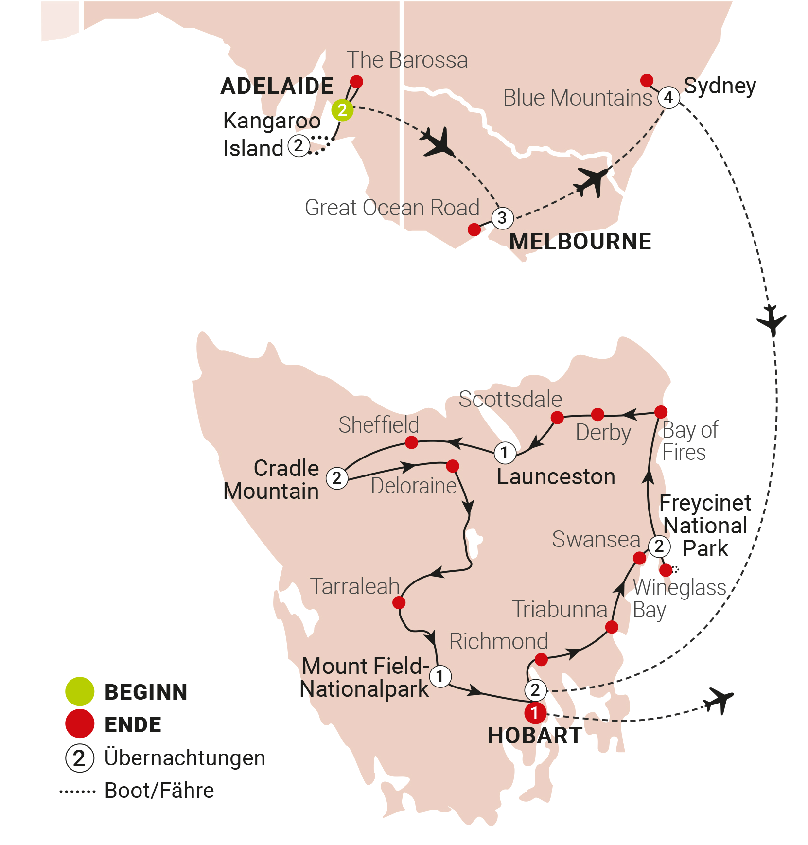 Unsere vielfältige Erlebnisreise kombiniert die wichtigsten Attraktionen und modernen Städte des südlichen Australiens mit den wildromantischen Landschaftsformen des Inselstaates Tasmanien. Erleben Sie die Metropolen Adelaide, Melbourne und Sydney kombiniert mit der spektakulären Great Ocean Road, den Eukalyptuswäldern der Blue Mountains, dem Tierparadies Kangaroo Island und der Weinkultur im Barossa Valley. Im Anschluss wird Sie das Naturparadies Tasmanien mit den Ikonen im Cradle Mountain und Freycinet-Nationalpark verzaubern. Abgerundet wird die intensive Erlebnisreise mit unserem erstklassigen Reisekomfort und den Leckereien der kreativen australischen Fusion-Küche. Downunder in bester Gesellschaft!